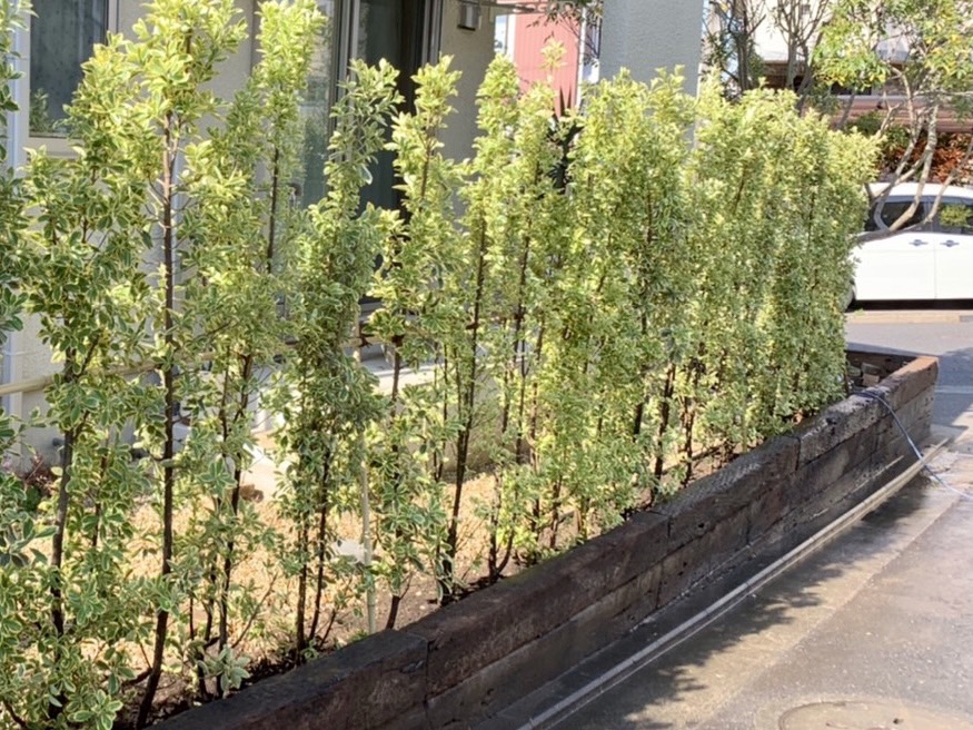 生垣を作る上で私が重視しているポイントは、@「丈夫である事」とA「生垣材の性質」です。 @多くの場合が「目隠しとして」、あるいは「緑のフェンスの様な役割」として施工する場合が多いと思います。 つまり、「見た目だけでなく、実際の生活に必要不可欠な物」になります。 となると、やはり「丈夫で、虫や病気にもかかりづらい品種」を選択したい所です。 A生垣材と言われる樹木にも様々な性質があります。枝が密に混み合い完全に遮蔽する樹木や、逆にチラチラと透けて見える樹木。 一年に1mも伸びる樹木や10cmしか伸びない樹木。後々の管理も考えた方が良いですね。ご要望に合わせて適材適所でご提案致します。 因みに当社でオススメしているのは… キンモクセイ 病気や害虫もこれといって無いですし、何より丈夫です。性質も非常に良く、キチンと刈り込めば枝が密に混みますし、透かす様に剪定する事も容易です。伸び過ぎてしまった時に強く切り詰める事もできます。 和・洋問わず使えますし、花の香りは代表的ですね。 マキ マキも非常に丈夫な樹種です。どちらかというと和風の趣きでしょうか。イヌマキは透かす様に、ラカンマキは壁の様にと使い分ける事もできます。 斑入りマサキ 最近のお気に入りで良く使います。お庭がパッと明るくなり、洋風のオシャレなお宅に良く似合いますね。どちらかと言うと枝が混み合うには時間を要しますが、近年は防犯上の観点からも多少透けて見える位の方が良い様に思います。